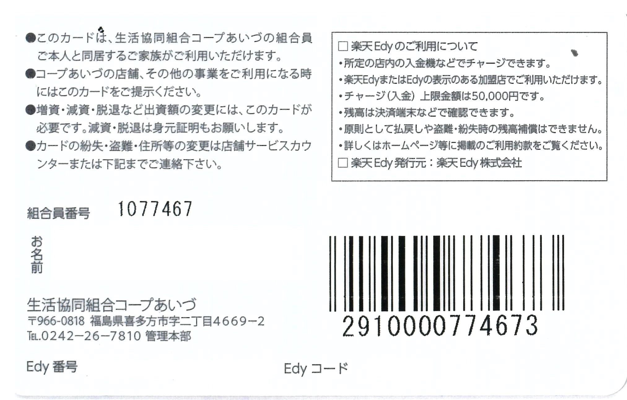 コープカードには、電子マネー「Edy」が付いています。