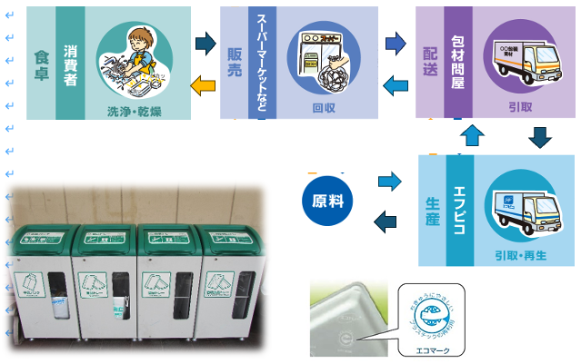 コープあいづでは、発泡トレーと透明トレーの2種類の回収を行っており、組合員さんにご協力頂いています。回収したトレーは、容器包装問屋さんを通じて、トレー製造メーカーに送られ、リサイクルされます。また、回収されたトレーなどでリサイクルされた再生トレーを積極的に使用し、石油資源の節約やCO2排出量の削減につなげています。