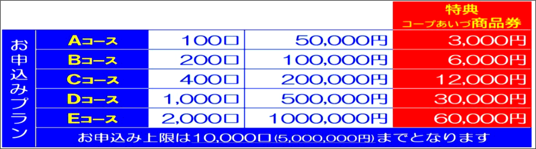 特 典 増資時(入金時)に特典のコープあいづ商品券をお渡しします